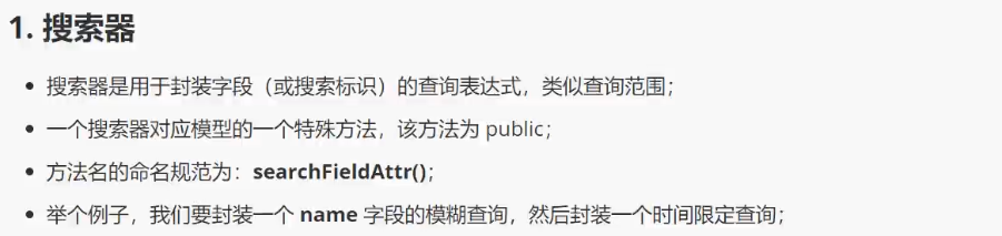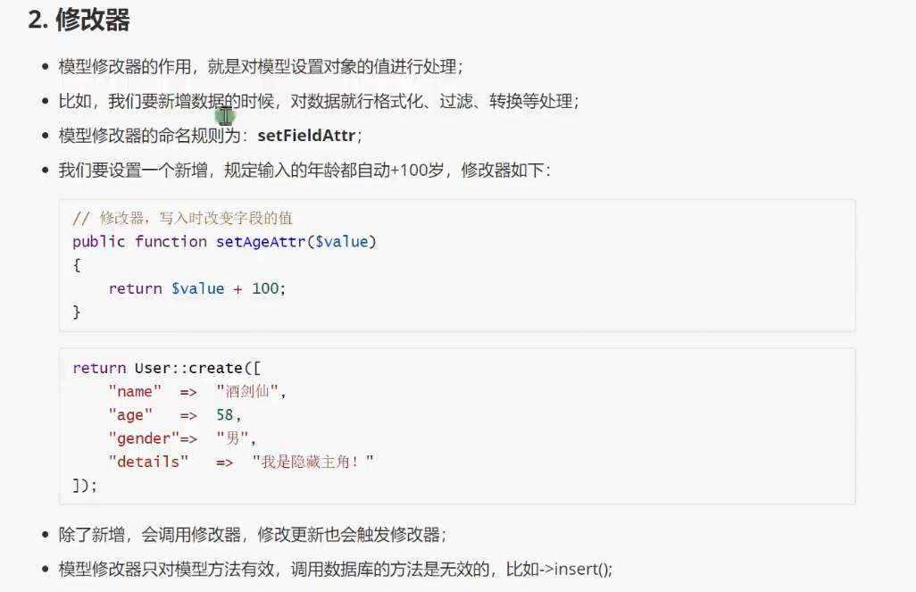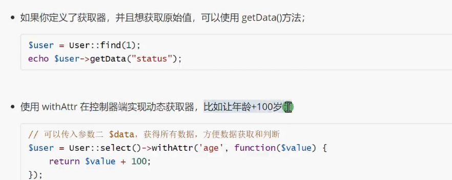 一个获取器对应模型的一个特殊方法,该方法为 public; 方法名的命名规范为:getFieldAttr();