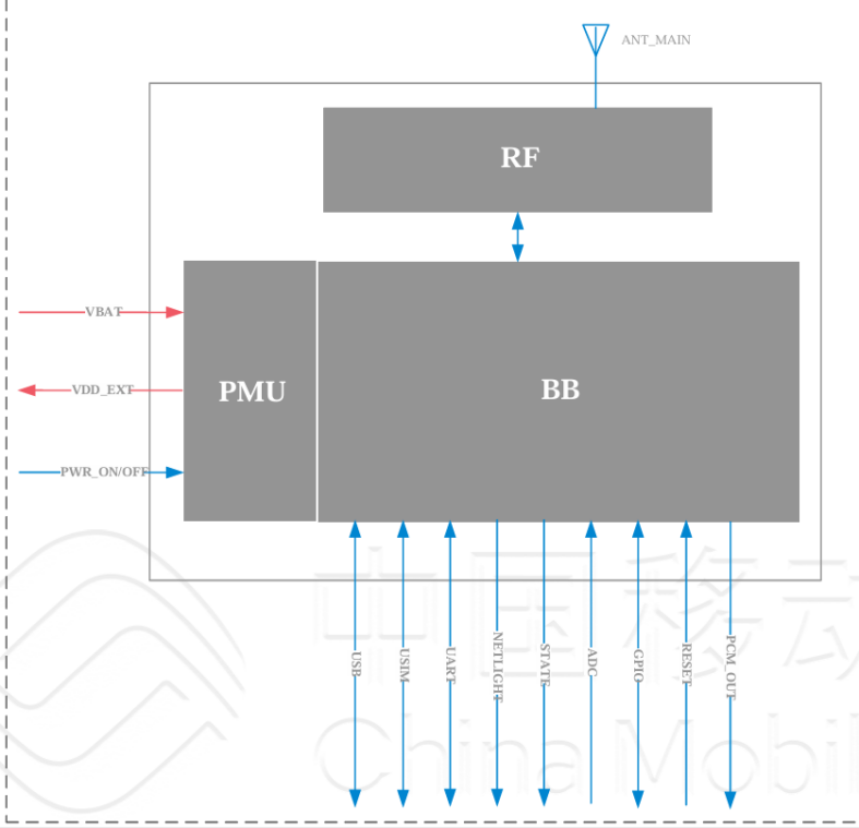 本节介绍模组硬件系统框图,模组硬件系统主要采用BaseBand+PMU+RF架构。模组硬件系统框图图下。