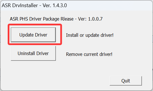 3、进入安装界面后点击Update Driver安装驱动,弹出提示框,点击确认,中途可能无响应属于正常现象,等待即可。