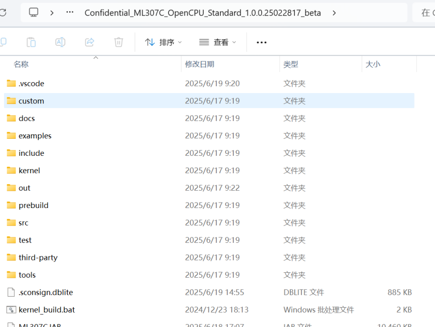 1、打开ML307C-DL-AT-openCPU文件夹,打开Confidential_ML307C_OpenCPU_Standard_1.0.0.25022817_beta,这个文件夹中就是我们的SDK程序。