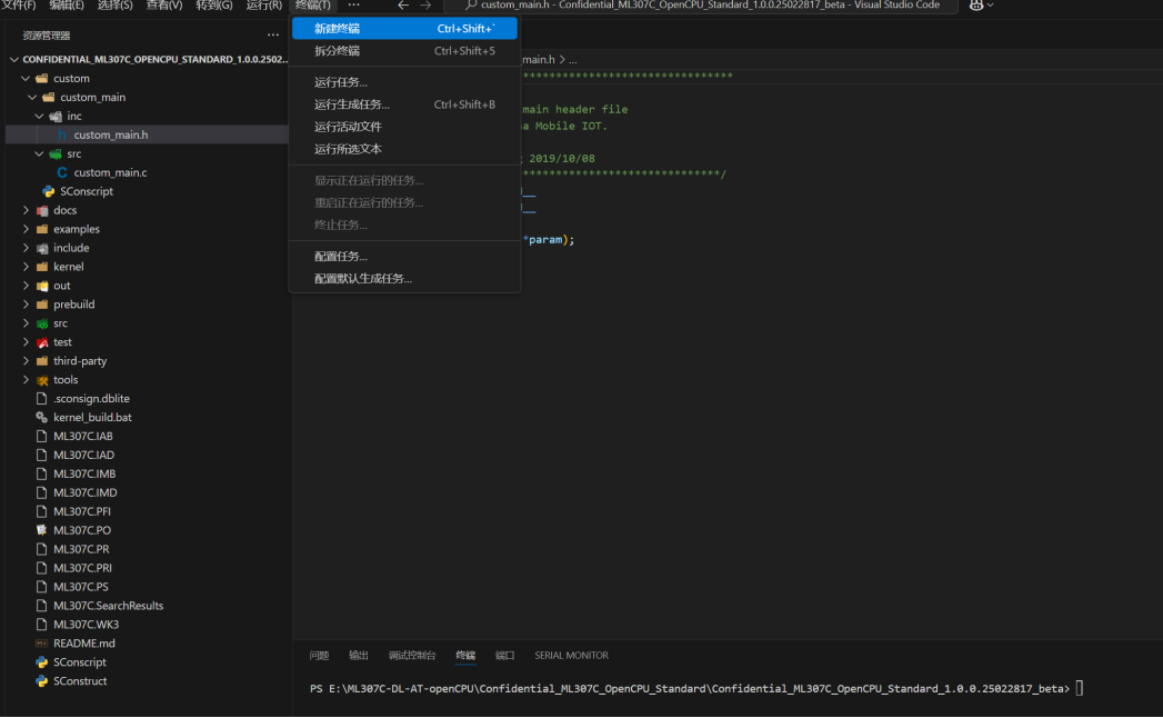 (2)打开SDK,解压Confidential_ML307C_OpenCPU_Standard_1.0.0.25022817_beta.rar,使用visual studio code或者命令行打开解压后的文件夹。