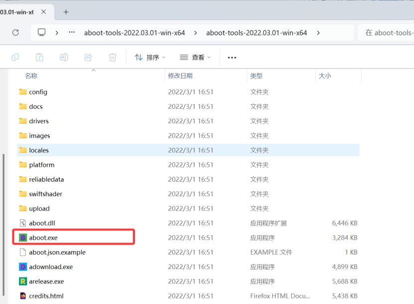 (2)打开开发工具,解压aboot-tools-2022.03.01-win-x64.rar,进入解压后的文件夹。打开aboot.exe。