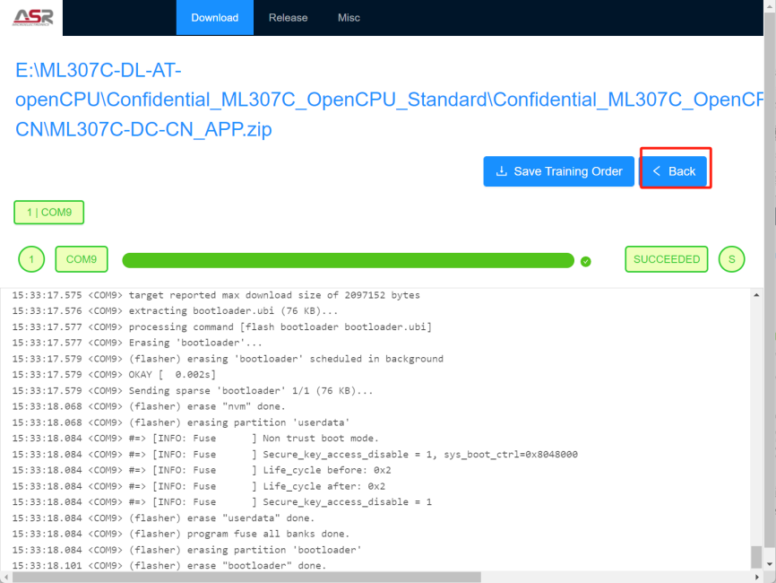 (6)固件下载结束后,点击“Back”按钮,断电重新启动模组。如果没有重启模组,会导致串口占用。