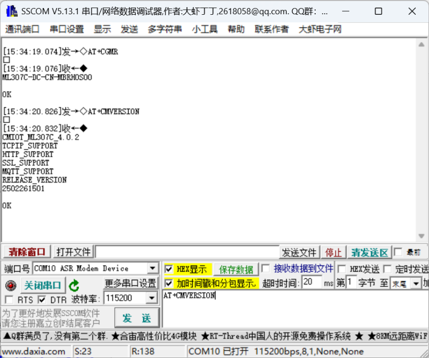 (7)模组重新启动后,可以通过窗口工具,发送AT+CGMR读取硬件版本号、AT+CMVERSION读取软件版本以及支持的服务,确认固件烧录成功。