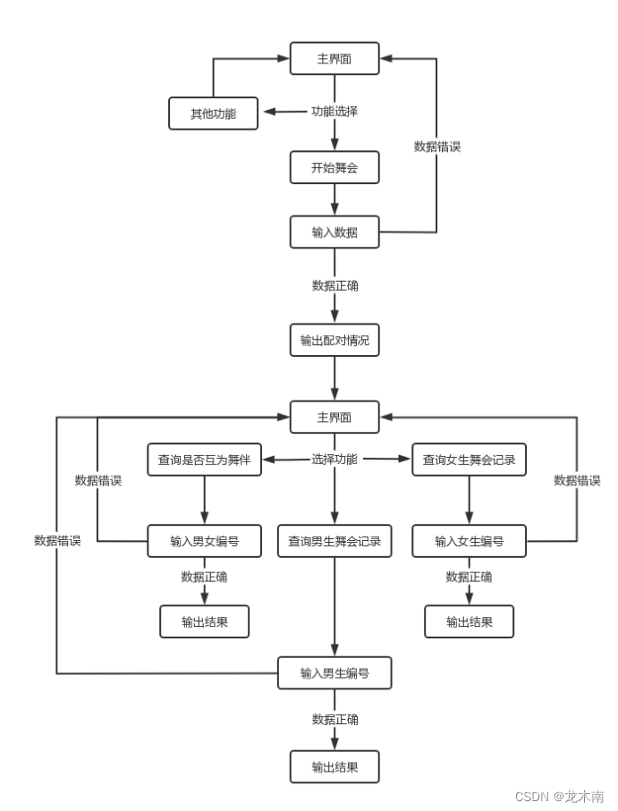 当然,如果输入了不存在的男女生编号,系统将会提示错误!这次舞会男生有10人,女生有12人,如果输入的男女生编号超过10和12,则系统提示错误