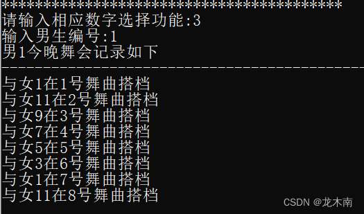 使用3查询男生舞会记录功能,查询1号男生的舞会记录,可查询出该男生今晚搭配的女生有哪些,对应的舞曲编号为多少