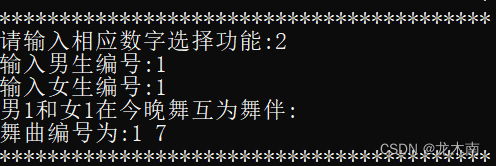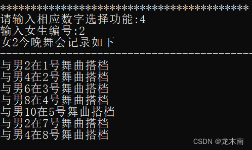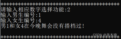 输出舞会的配对情况后,就可以选择使用相应的功能了,例如使用2查询是否互为舞伴功能,查询1号男生和4号女生是否互为舞伴,若是,输出相应的舞曲编号