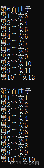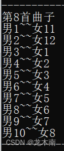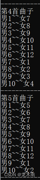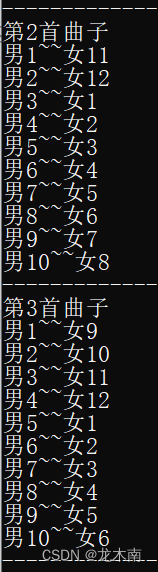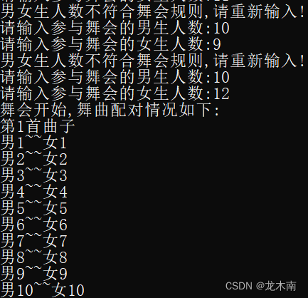 此时重新输入的男女生人数为10和9,,违反了舞会的第②条规则,依旧系统被要求重新输入此时重新输入的男女生人数为10和12,符合舞会规则,舞会开始,并输出各个舞曲男女生的配对情况