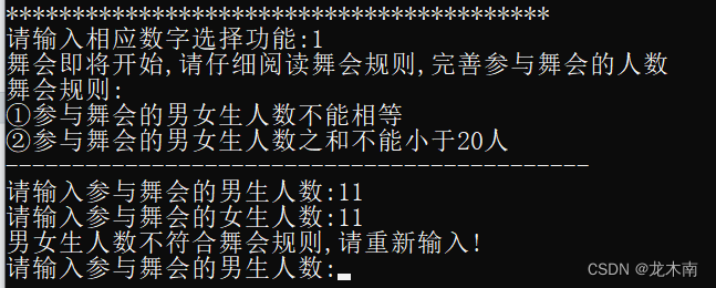 输入1,开始舞会,系统将会说明舞会规则,随后用户完善相应信息,经系统判定后,不满足舞会规则的数据将无法开始舞会,例如此时男女生都为11人,违反了舞会的第①条规则,被系统要求重新输入