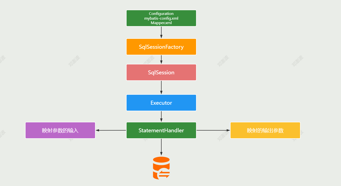 StatementHandler 首先通过 ParameterHandler 完成 SQL 语句的实参绑定,然后通过 java.sql.Statement 对象执行 SQL 语句并得到结果集,最后通过 ResultSetHandler 完成结果集的映射,得到结果对象并返回。