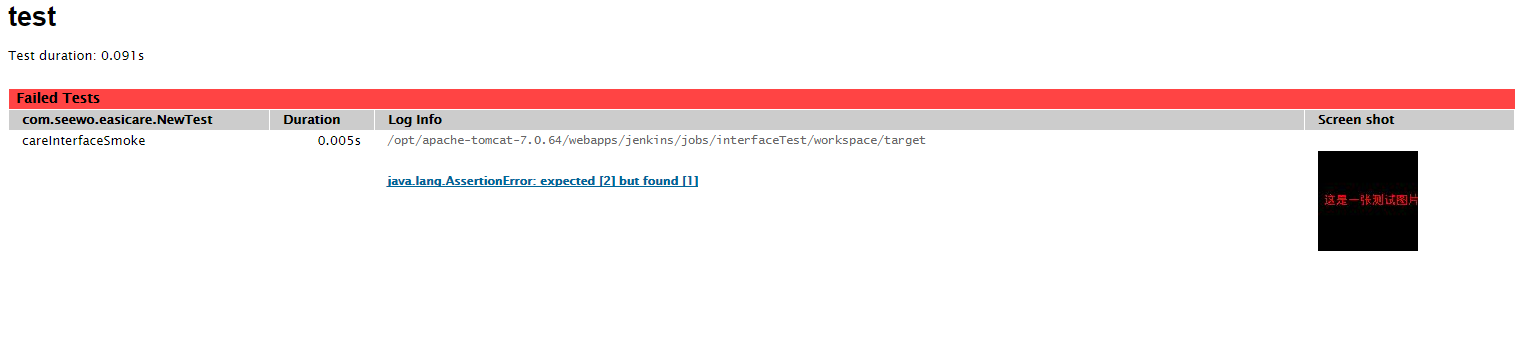 @Test public void careInterfaceSmoke(){ Assert.assertEquals(1,2); } @AfterMethod(alwaysRun = true) public void afterMethod(ITestResult result) throws Exception { if (!result.isSuccess()) catchExceptions(result); } public void catchExceptions(ITestResult result) { System.out.println("result" + result); String methodName = result.getName(); System.out.println(methodName); if (!result.isSuccess()) { File file = new File(""); Reporter.setCurrentTestResult(result); System.out.println(file.getAbsolutePath()); Reporter.log(file.getAbsolutePath()); String filePath = file.getAbsolutePath(); filePath = filePath.replace("/opt/apache-tomcat-7.0.64/webapps","http://172.18.44.114:8080"); Reporter.log("<img src='"+filePath+"/"+result.getName()+".jpg' height='100' width='100'/>"); int width = 100; int height = 100; String s = "这是一张测试图片"; File screenShotFile = new File(file.getAbsolutePath()+"/"+result.getName()+".jpg"); Font font = new Font("Serif", Font.BOLD, 10); BufferedImage bi = new BufferedImage(width, height, BufferedImage.TYPE_INT_RGB); Graphics2D g2 = (Graphics2D)bi.getGraphics(); g2.setBackground(Color.BLACK); g2.clearRect(0, 0, width, height); g2.setPaint(