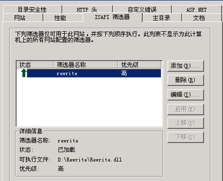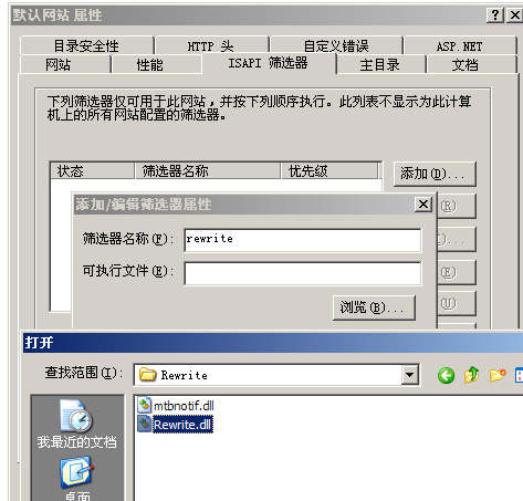 3.选择“ISAPI”标签 → 添加 → 筛选器起个名字 → “浏览” → 找到解压好的目录 → → 选“ISAPI_Rewrite.dll”。