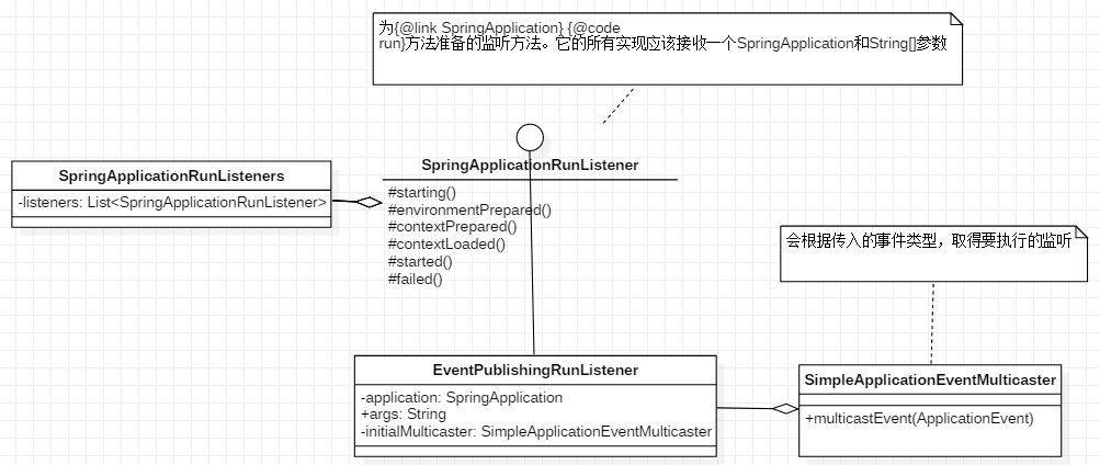public EventPublishingRunListener(SpringApplication application, String[] args) { this.application = application; this.args = args; this.initialMulticaster = new SimpleApplicationEventMulticaster(); for (ApplicationListener<?> listener : application.getListeners()) { this.initialMulticaster.addApplicationListener(listener); // 把listener放到传播器里 } }