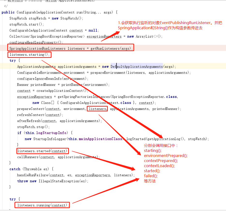 2.然后在启动流程run()方法中,会先获取EventPublishingRunListener对象,然后循环执行前面获取的监听。
