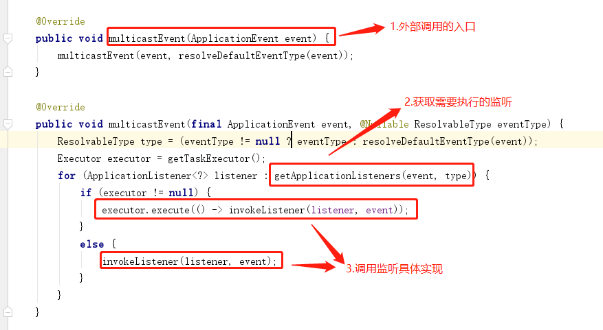 * SimpleApplicationEventMulticaster对象会根据传入的不同事件对象执行不同的监听。