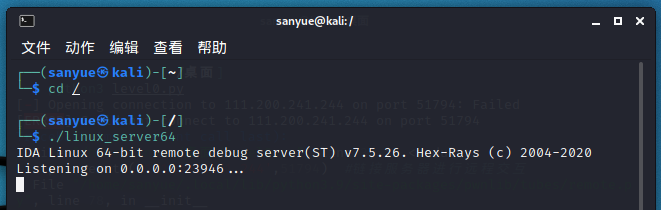 然后把windows上下载好的ida中的dbgsrv文件夹中的linux_server和linux_server64拖到虚拟机上,再把题目给的附件放在一个自己比较熟悉的目录,我就直接放在根目录了。(还不熟悉),然后运行这个文件就可以发现