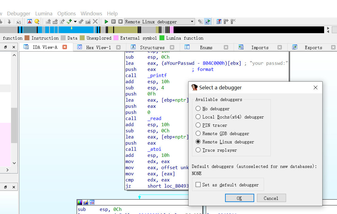 代表运行成功,这个时候就在windows里打开ida,点击debugger,选择remote linux 填写相应的文件位置,input也填文件位置,目录就填除了文件的所在目录(pwd命令就可以知道当前所在目录),