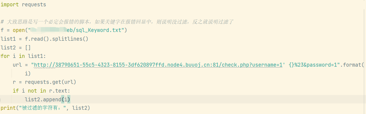 哦对,回到之前被替换过滤的问题,我们虽然知道一些被替换的关键字,但不是全部,我们虽然可以直接查看结果,只要一有报错就说明有关键字被过滤了,不过,我们也可以直接写一个简单的小脚本fuzz一下,来得知哪些总共有哪些字符被过滤了。