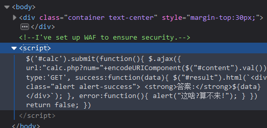 发现真的是前端验证,还发现了好像有一个calc.php的文件,而且很奇怪的一点,他传参不是直接传如内容,先是加了个单引号,这也和后面的一个waf有关,先去访问一下calc.php
