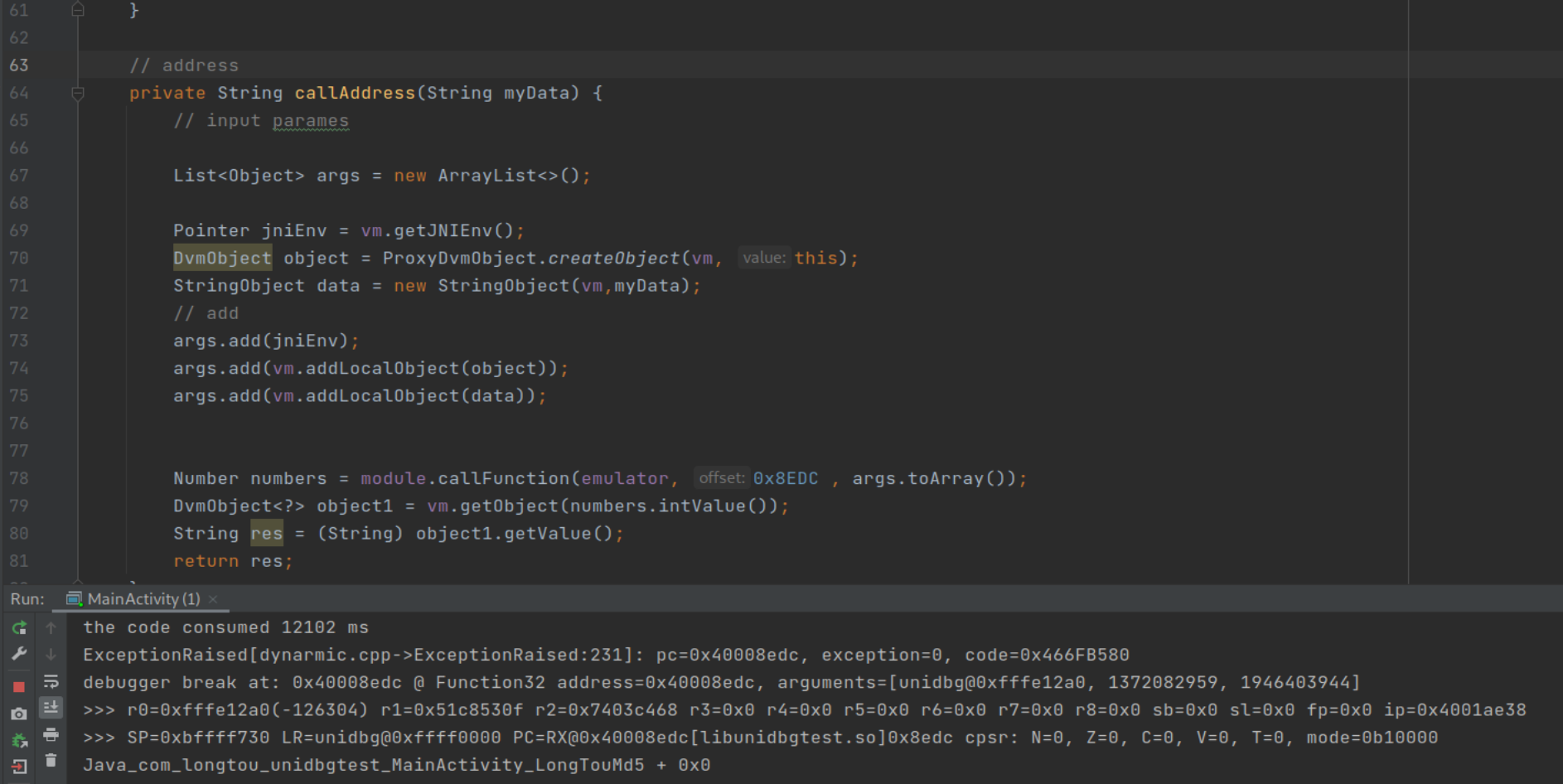 假如说这个so很复杂,不想分析,可以使用unidbg黑盒调用去处理.