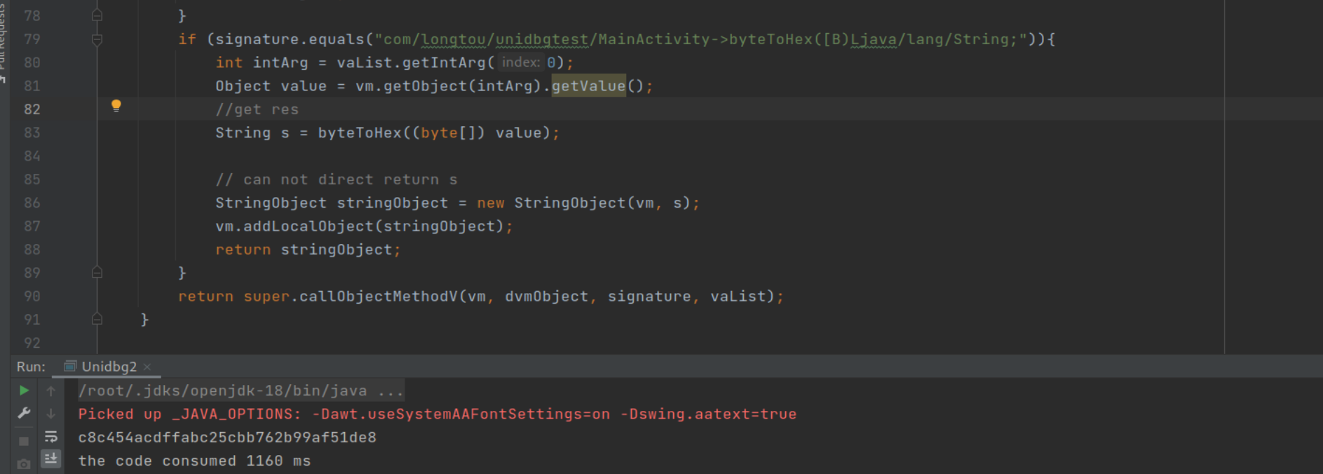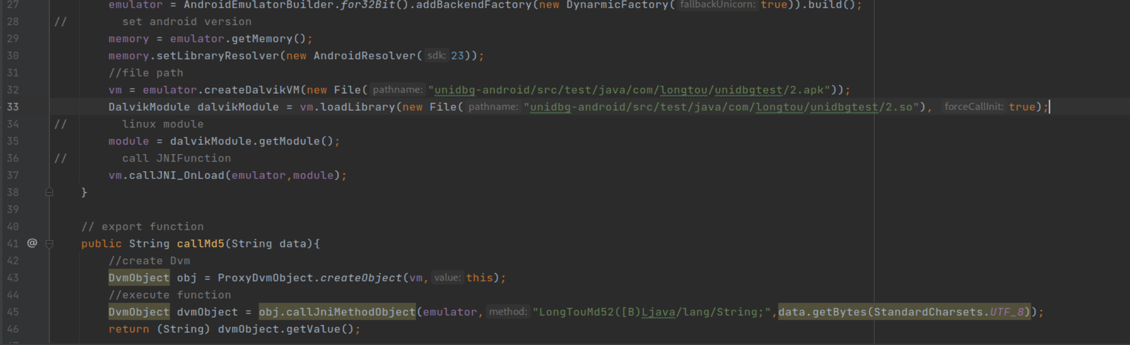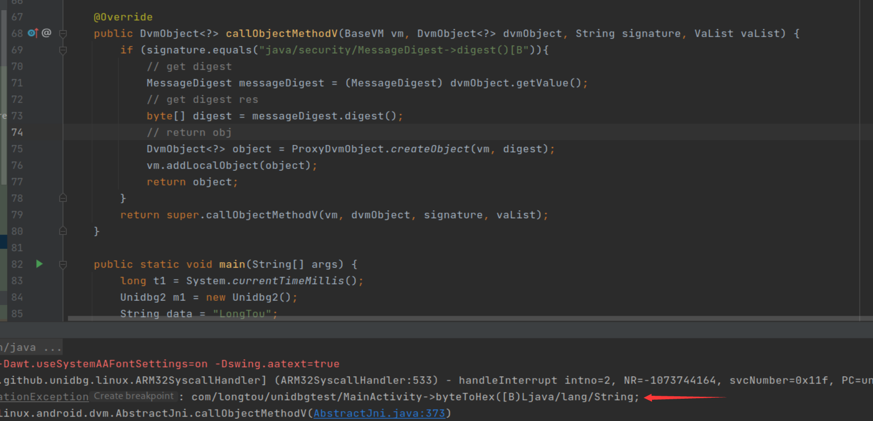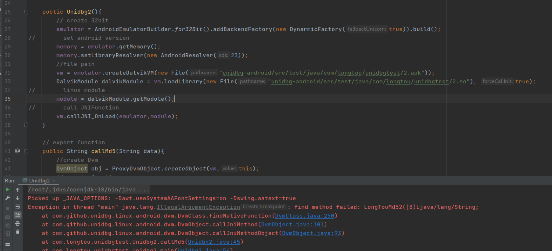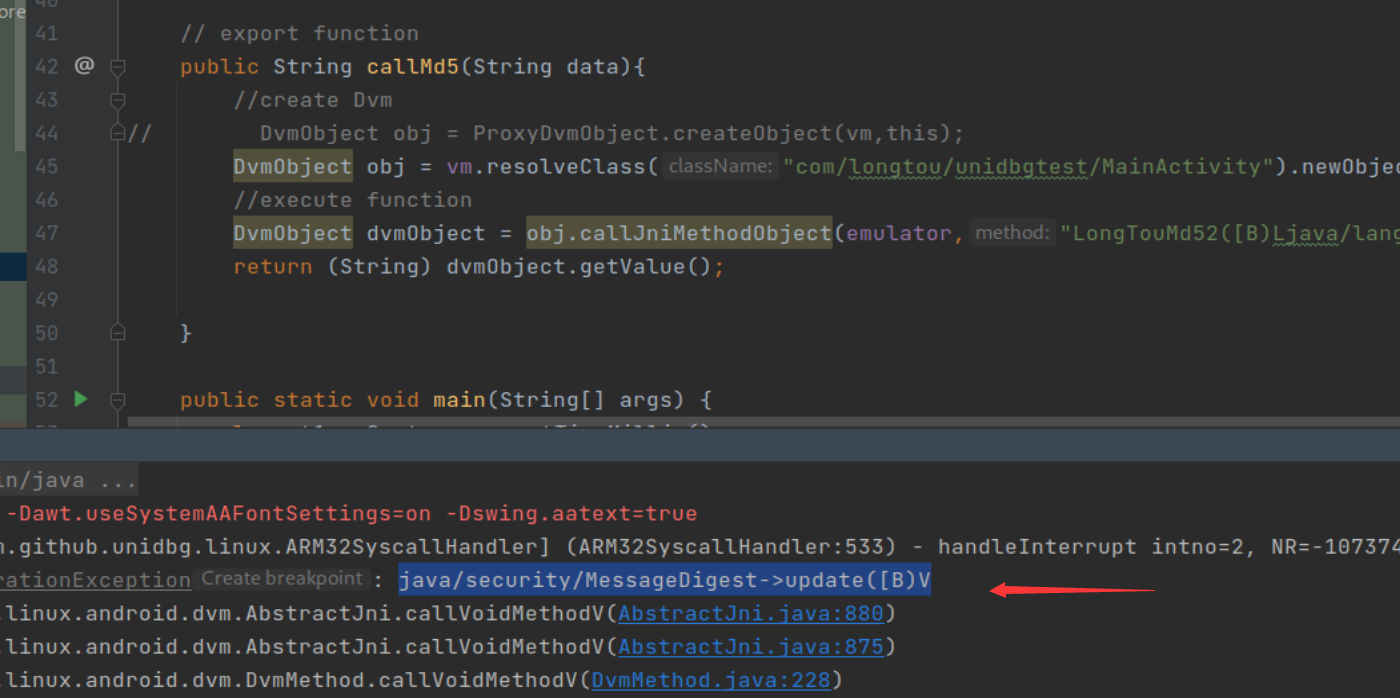 DvmObject obj = vm.resolveClass("com/longtou/unidbgtest/MainActivity").newObject(null);