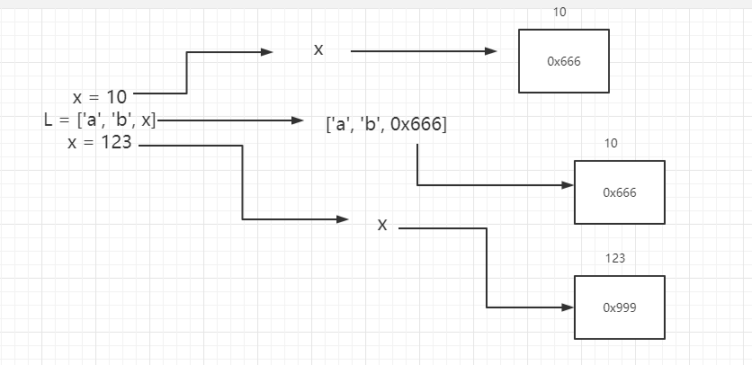 因为在列表L定义时,x就是10的内存地址,整型是不可变类型(后面会说),所以对x的赋值操作不过是重新分配了一个地址,存了123这个值,再把这个地址赋值给x,之前L中的引用任然是10的内存地址
