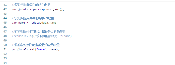 2,在当前的接口的tests中将响应的结果中的数据赋值给一个变量,将次变量设置为全局变量