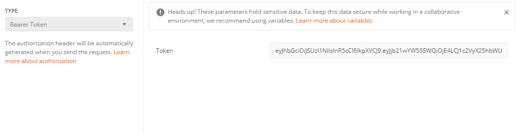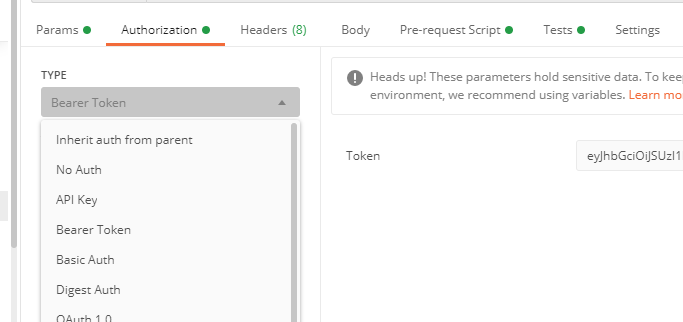 一般的验证方式有通过token值来进行验证,选择Bearer Token然后输入token值;