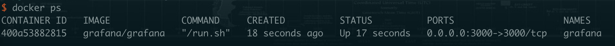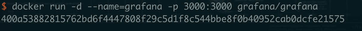 docker run -d --name=grafana -p 3000:3000 grafana/grafana # 使用grafana镜像来创建一个新的容器(-d: 后台运行容器,并返回容器ID;-p: 指定端口映射,格式为:主机(宿主)端口:容器端口)