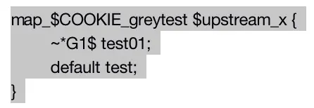 如上面的配置,$COOKIE_greytest映射第一列~*G1$、default等,也就是第一个参数,$upstream_x 映射第二列test01、test等,也就是第二个参数,当$COOKIE_greytest值为G1$时,$upstream_x值就是test01,以此类推。如果都没匹配到,那就是default的值,如果没有定义default,那就是空。