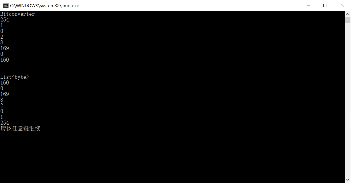 static void Main(string[] args) { List<byte> frameBytes = new List<byte>(); frameBytes.Add(0XA0); frameBytes.Add(0X00); frameBytes.Add(0XA9); frameBytes.Add(0X08); frameBytes.Add(0X02); frameBytes.Add(0X00); frameBytes.Add(0X01); frameBytes.Add(0XFE); byte[] bss = frameBytes.ToArray();