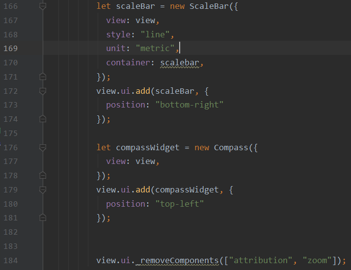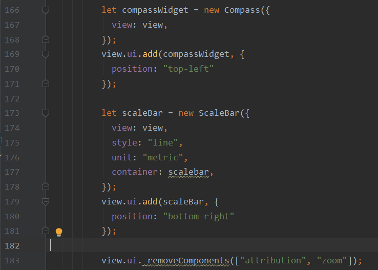 那么此时 dojo 模块中的,170行后面的所有代码 (此处为 compassWidget 、view.ui.add 、 removeCompents)均不会正常加载。