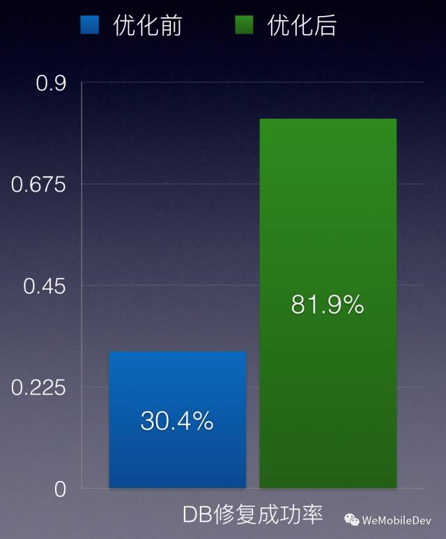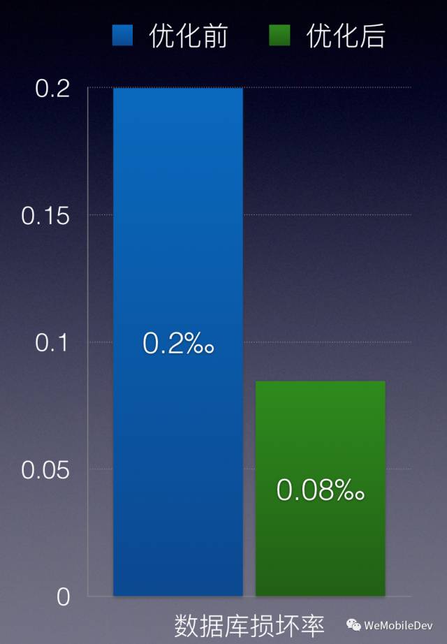 众所周知,微信在后台服务器不保存聊天记录,微信在移动客户端所有的聊天记录都存储在一个 SQLite 数据库中,一旦这个数据库损坏,将会丢失用户多年的聊天记录。而我们监控到现网的损坏率是0.02%,也就是每 1w 个用户就有 2 个会遇到数据库损坏。考虑到微信这么庞大的用户基数,这个损坏率就很严重了。更严重的是我们用的官方修复算法,修复成功率只有 30%。损坏率高,修复率低,这两个问题都需要我们着手解决。