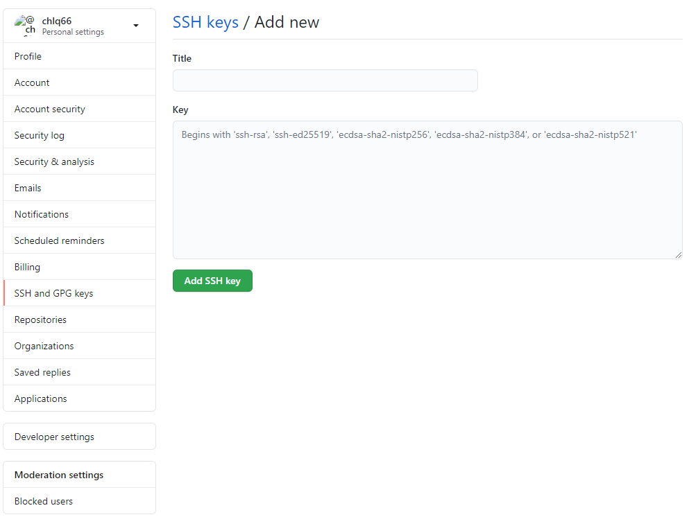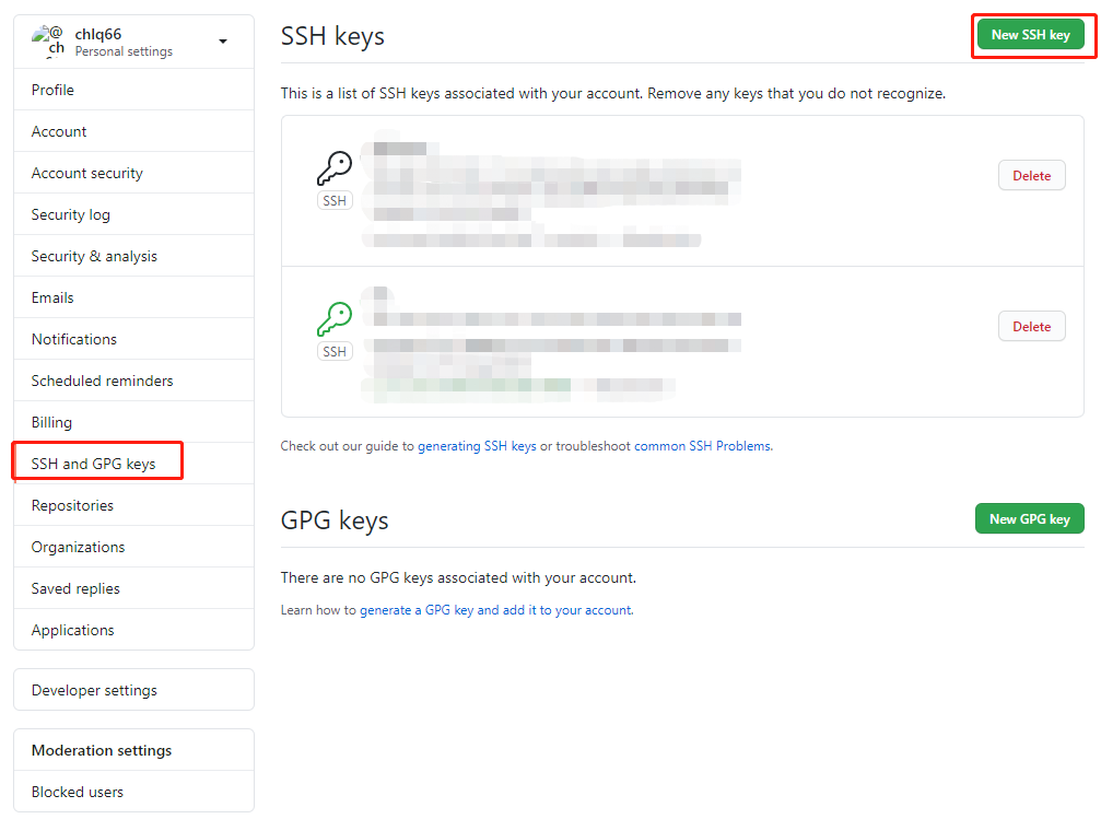 选择SSH and GPG keys,点击New SSH key
