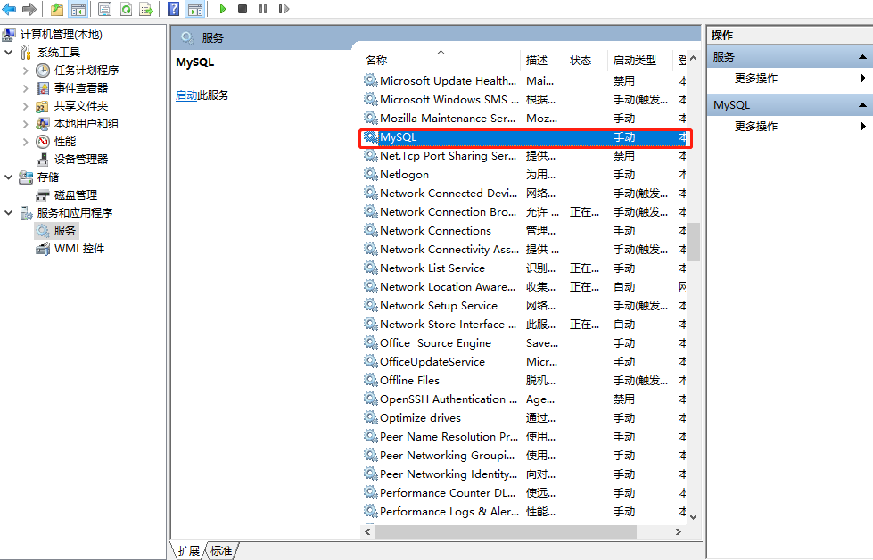 右键 我的电脑 -> 管理 -> 服务与应用程序 —> 服务 -> MYSQL -> 启动