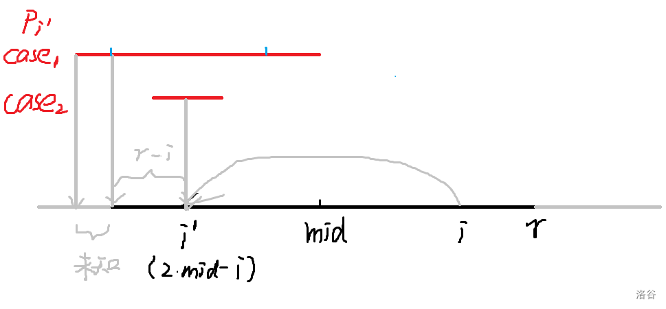 记\(i'\)为\(i\)关于\(mid\)对称过来的位置(如图,这个位置就是\(2\times mid-i\)),根据回文串的性质,如果以\(i'\)为中心的回文串仍在黑色段范围内(即图中\(case_2\)),那么\(p_i=p_{i'}\),因为要是\(p_i\)还能扩展,\(p_{i'}\)早就扩展过了。如果不在(即图中\(case_1\)),那么\(i\)的答案最多取到上图蓝色框定范围的半径(长度为\(r-i\)),因为有个未知段,同时这种情况下我们还需在当前\(p_i\)基础上向两边暴力扩展判断。