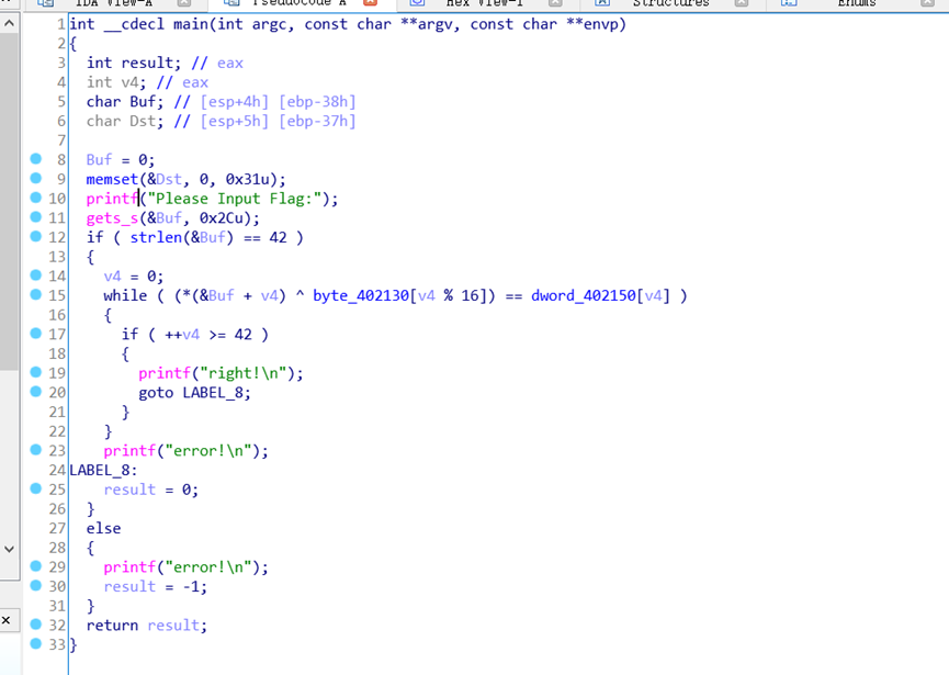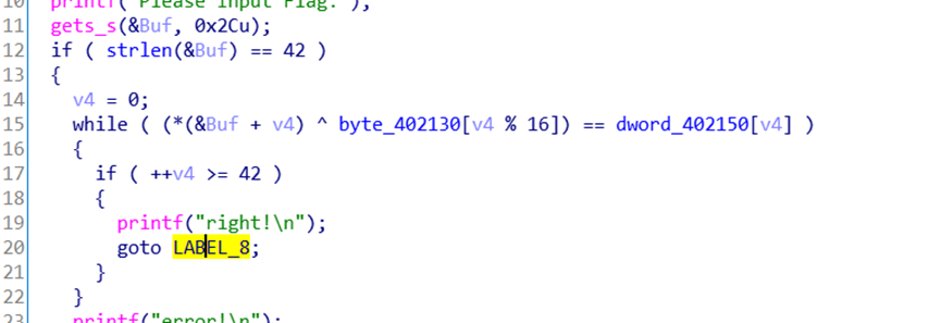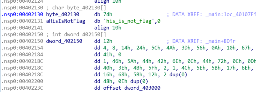 byte_402130 = 'this_is_not_flag' var = [ 0x12, 0x00, 0x00, 0x00, 0x04, 0x00, 0x00, 0x00, 0x08, 0x00, 0x00, 0x00, 0x14, 0x00, 0x00, 0x00, 0x24, 0x00, 0x00, 0x00, 0x5C, 0x00, 0x00, 0x00, 0x4A, 0x00, 0x00, 0x00, 0x3D, 0x00, 0x00, 0x00, 0x56, 0x00, 0x00, 0x00, 0x0A, 0x00, 0x00, 0x00, 0x10, 0x00, 0x00, 0x00, 0x67, 0x00, 0x00, 0x00, 0x00, 0x00, 0x00, 0x00, 0x41, 0x00, 0x00, 0x00, 0x00, 0x00, 0x00, 0x00, 0x01, 0x00, 0x00, 0x00, 0x46, 0x00, 0x00, 0x00, 0x5A, 0x00, 0x00, 0x00, 0x44, 0x00, 0x00, 0x00, 0x42, 0x00, 0x00, 0x00, 0x6E, 0x00, 0x00, 0x00, 0x0C, 0x00, 0x00, 0x00, 0x44, 0x00, 0x00, 0x00, 0x72, 0x00, 0x00, 0x00, 0x0C, 0x00, 0x00, 0x00, 0x0D, 0x00, 0x00, 0x00, 0x40, 0x00, 0x00, 0x00, 0x3E, 0x00, 0x00, 0x00, 0x4B, 0x00, 0x00, 0x00, 0x5F, 0x00, 0x00, 0x00, 0x02, 0x00, 0x00, 0x00, 0x01, 0x00, 0x00, 0x00, 0x4C, 0x00, 0x00, 0x00, 0x5E, 0x00, 0x00, 0x00, 0x5B, 0x00, 0x00, 0x00, 0x17, 0x00, 0x00, 0x00, 0x6E, 0x00, 0x00, 0x00, 0x0C, 0x00, 0x00, 0x00, 0x16, 0x00, 0x00, 0x00, 0x68, 0x00, 0x00, 0x00, 0x5B, 0x00, 0x00, 0x00, 0x12, 0x00, 0x00, 0x00 ] flag = '' for i in range(42): flag += chr(var[i*4] ^ ord(byte_402130[i % 16])) print(flag)