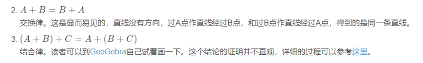 设椭圆曲线上有两点,A和B点,那么作过这两点的直线与该曲线相交于第三点(C点),然后关于X轴对称得到D点,则D为这两个点的和,记作D = A + B 。很明显,D点也在该曲线上。所以椭圆曲线上两点之和也是曲线上的点。