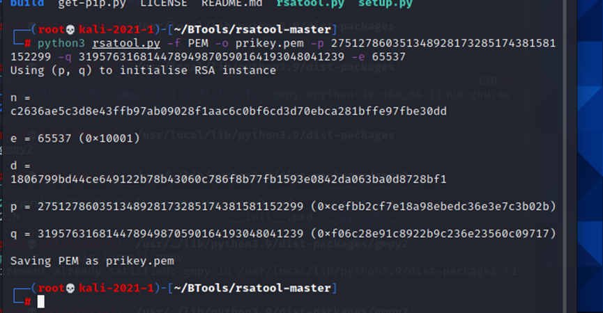 python rsatool.py -f PEM -o private.pem -p 275127860351348928173285174381581152299 -q 319576316814478949870590164193048041239 -e 65537