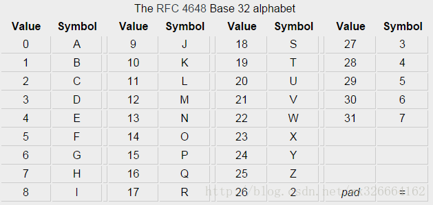 Base64用6位表示字符,base32 就是用5位表示字符,同理base16就是用4位表示字符