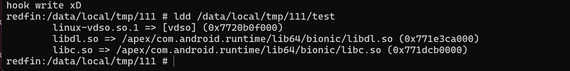 #include <stdio.h> #include <stdlib.h> #include <sys/auxv.h> char xxx[] = "tlsn_wheeler"; int main(){ puts("nihao"); puts(xxx); return 0; } // '/home/tlsn/Btools/NDKXX/NDK24/toolchains/llvm/prebuilt/linux-x86_64/bin/aarch64-linux-android24-clang' ./test.c -g -o ./test