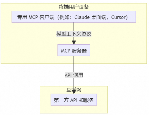Local MCP Server 是指在用户本地设备上运行的 MCP 服务器。在这种模式下,MCP 客户端(如Claude Desktop或Cursor)通过本地进程通信(stdin/stdout)与 MCP 服务器交互,服务器再连接到互联网上的各种 API 和服务。这种架构简单直接,适合个人开发者使用,但存在一些局限性。