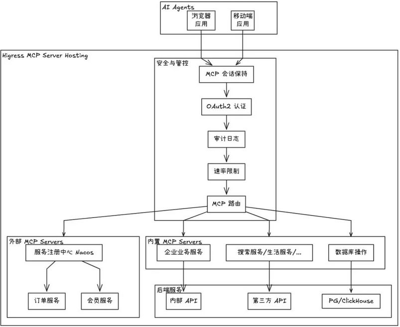 这种灵活的架构设计使得企业可以根据自身需求选择最适合的部署方式,既可以享受 Higress 提供的一站式托管服务,也可以保持现有 MCP Server 的独立性。