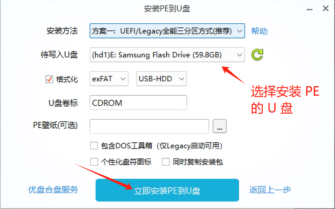 随后选择需要安装 PE 的 U 盘,其他选项默认即可: