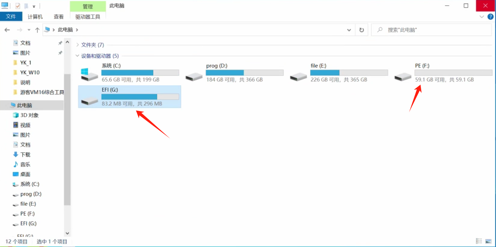 安装完成后会多出两个盘符,其中 EFI 盘为 PE 系统盘(不要往这个盘存入数据),另一个专门用来存放镜像和其他工具的盘: