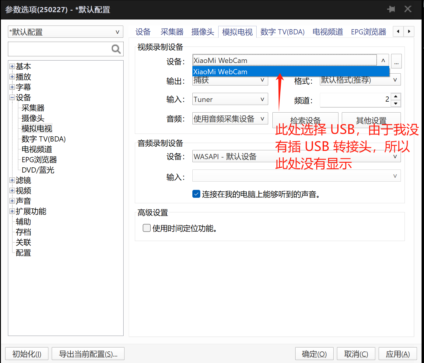 随后我们下载 PotPlayer 工具,安装后,右键界面 -> 选项 -> 模拟电视,在此处将 设备 切换为 USB 接口: