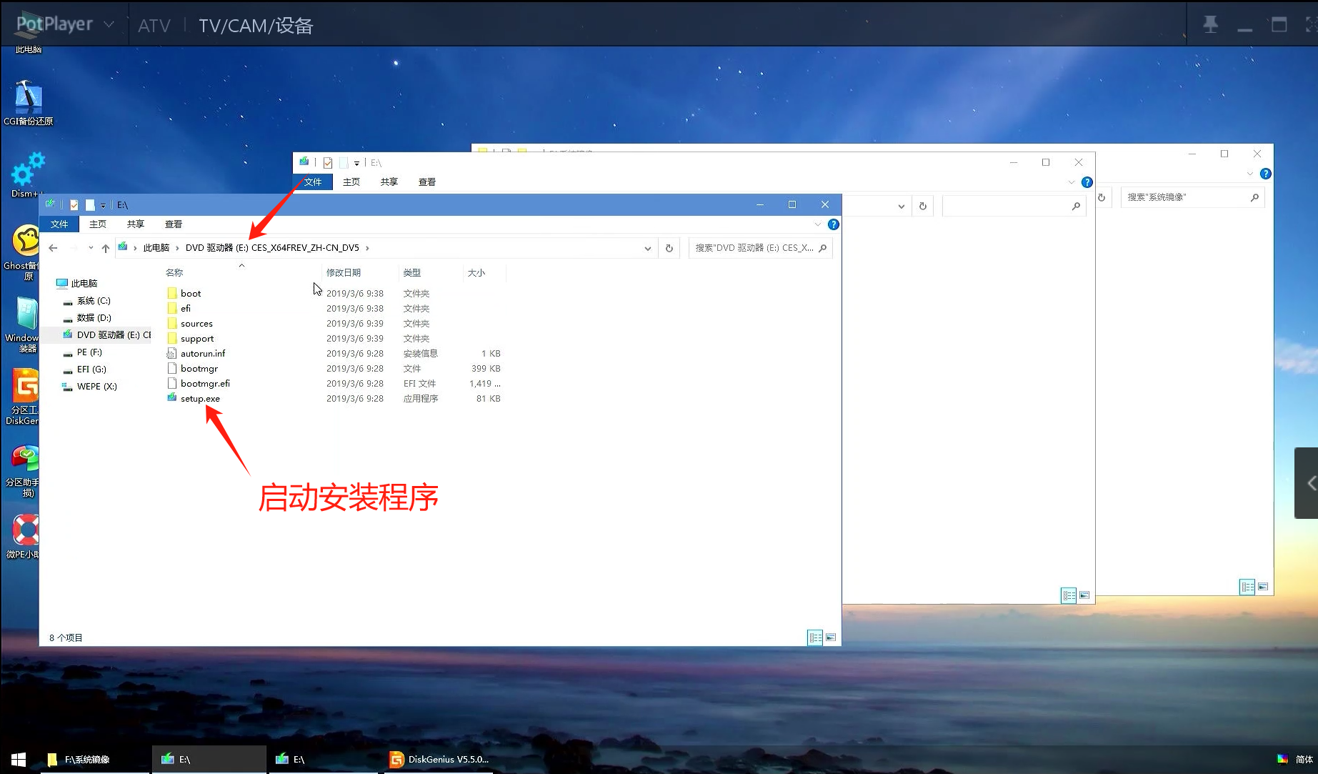 分区完成后,我们打开存放镜像的文件夹,右击镜像,选择装载,然后这个镜像会出现在我的电脑中,打开后打开安装程序: